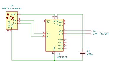 Der MCP2221 braucht er nur eine minimale externe Beschaltung und kann daher gut auf die Platine des Microcontrollers mit aufgelötet werden. Statt den 5 Tantal-Elektrolytkondensatoren des MAX232 braucht der MCP2221 nur einen keramischen Kondensator. Die Schaltung dazu sieht so aus.